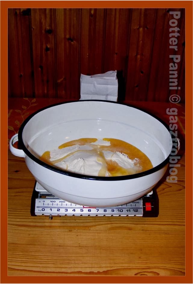 A tésztához egy tálba mértem a lisztet, elmorzsoltam benne a vajat, hozzáadtam a porcukrot, a szódabikarbónát, felvertem a tojásokat egy csipet sóval, belekeverem a tojásba a fűszereket, a liszthez adom és belecsorgattam a mézet, jól összedolgoztam és addig adtam lisztet hozzá míg el nem vált az edény falától. Kb. 3-4 milliméter vastagságúra nyújtottam gyakran felemelgetve és újralisztezve az alját, tetejét nehogy leragadjon.